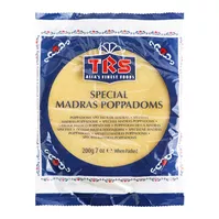 Special Madras Poppadoms TRS to tradycyjne indyjskie placki, które są nieodzownym elementem kuchni indyjskiej, znane z wyjątkowej chrupkości i smaku. Wykonane z mąki z soczewicy, poppadomy TRS są niezwykle lekkie, co sprawia, że idealnie nadają się do serwowania jako przystawka lub dodatek do głównych dań, takich jak curry czy ryż. Można je smażyć na głębokim tłuszczu, dzięki czemu stają się chrupiące i pełne aromatu, lub opiekać na ogniu, co nadaje im bardziej intensywny, dymny smak. Popularne w kuchni południowoindyjskiej, poppadomy są często podawane z różnorodnymi chutneyami, dipami lub sałatkami. Dzięki swojej wszechstronności można je serwować jako samodzielną przekąskę, jako dodatek do posiłku, a nawet używać jako "łyżkę" do sosów i past. TRS dba o najwyższą jakość składników, co gwarantuje autentyczny smak Indii w każdym kęsie. Special Madras Poppadoms to doskonały wybór dla miłośników indyjskiej kuchni, którzy pragną wzbogacić swoje kulinarne doświadczenia o tradycyjny, egzotyczny akcent.